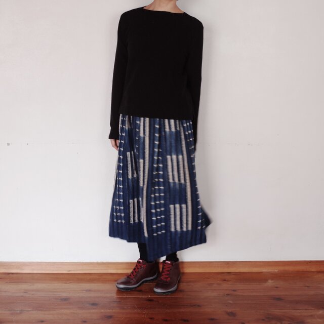 スカートのデザインは、前後に6つずつタックが入ったボリューム感のあるスカートです。長さと生地の厚みがあるので拡がりすぎず落ち着いた印象です。ウエストはゴムですのでとても着心地が良く脱ぎ着も楽です。ゴムサイズは緩めにしていますので必要であれば調整ください。