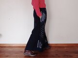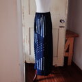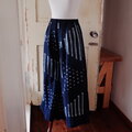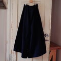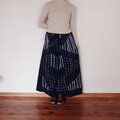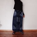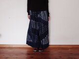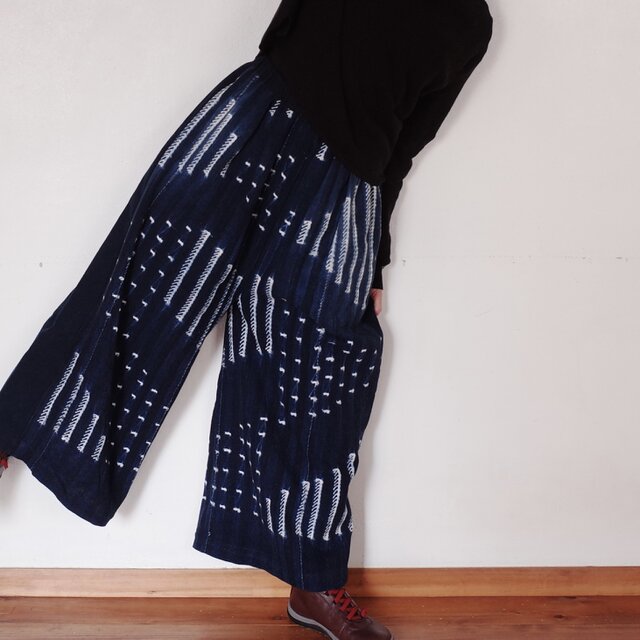 パンツですが、股上と幅にゆとりがあり穿くとスカートのように見えます。前見頃はボボ族藍染生地、後ろ見頃は着心地が良く柔らかな両面起毛の綿生地です。ウエストはゴムですのでとても着心地が良く脱ぎ着も楽です。ゴムサイズは緩めにしていますので必要であれば調整ください。