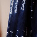 藍染めを制作しているボボ族はアフリカ西部のブルキナファソに住む民族です。手織りの帯状の布を継いで1枚の布にし、絞り染めを施します。天然の藍には防虫効果(蚊除け)もあるそうで、西アフリカ各地で昔から藍染め布が制作されています。デザインや染め方などバライティーに富んでおり、見ているだけでも楽しくなるアフリカンデザインです。