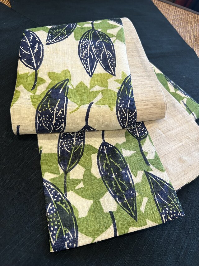麻地に葉っぱ模様の型染め