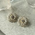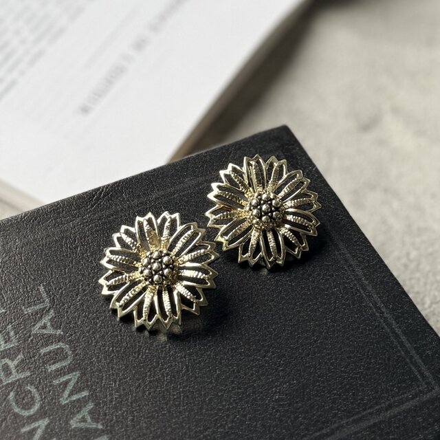 ひまわりやデイジーを想起させる繊細なオープンワークのペタルが特徴的なデザイン。中央の凹凸感のある立体的なテクスチャーがヴィンテージらしい重厚感を与えています。