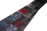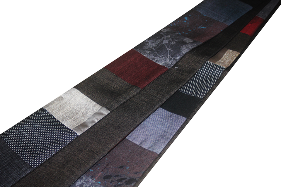 落ち着いた墨色や濃紺の紬をベースに、鮮やかな色彩がアクセントとして映える、唯一無二のパッチワーク角帯です。西陣織の織士が、長年培った審美眼で様々な紬の生地を選び抜き、一枚一枚丁寧に縫い合わせて仕立てました。