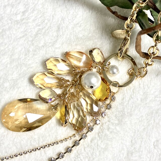 真鍮(チェーン部分)、ガラス(各種パーツ、パールもガラスパール)、アクリル樹脂(ラグビー型のパーツのみ)