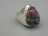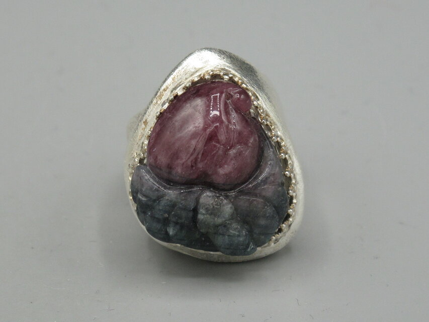 スモモの形にカット彫刻した大きなバイカラートルマリンのリングです。