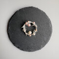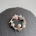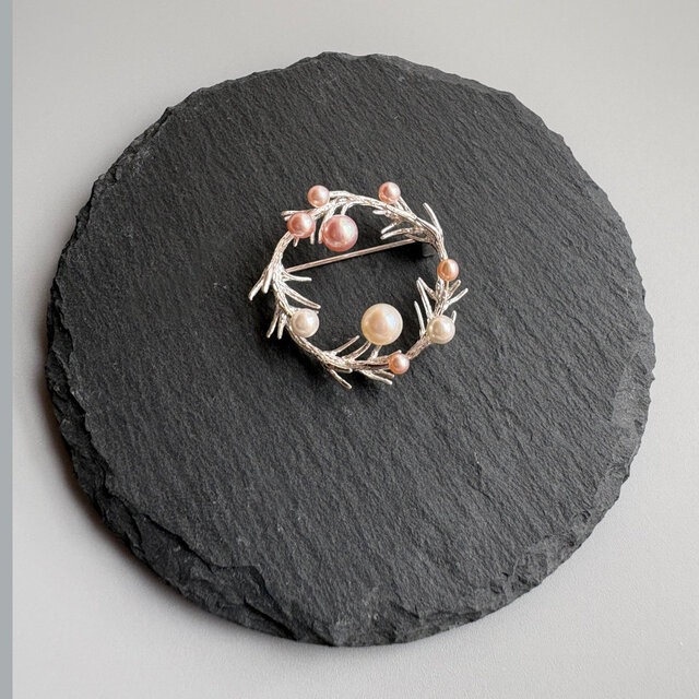 贅沢に組み合わせたホワイト&ピンクの大小パールブローチ、ハッピーで優しい雰囲気が漂います。
