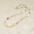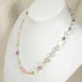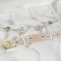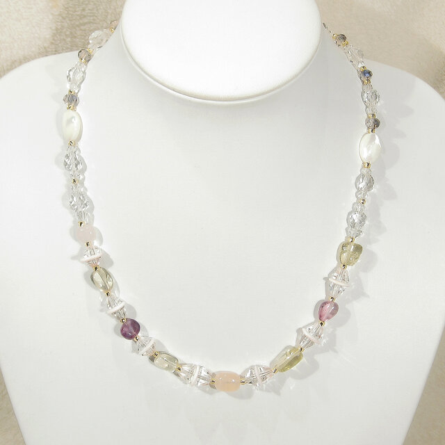 桜色の淡いピンク色のコンクシェル(スクエアカット)と輝きの綺麗な本水晶(多面カット)の組み合わせ、コロコロとした可愛い形のローズクォーツやレモンクォーツ、アメシストの、春を感じる気持ちの軽くなる色合いのネックレスです。照りの綺麗な貝パーツ(マザーオブパール。白蝶貝)も使っています。