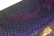 【A面:ヤモリ】静かに家を守る、現代的な守護意匠 落ち着いた地紋の中に、鮮やかなパープルで浮かび上がるヤモリ。古来より「家守」として親しまれてきたヤモリを、現代的なカラーリングでクールに表現しました。人目を引く個性的な背姿を演出します。