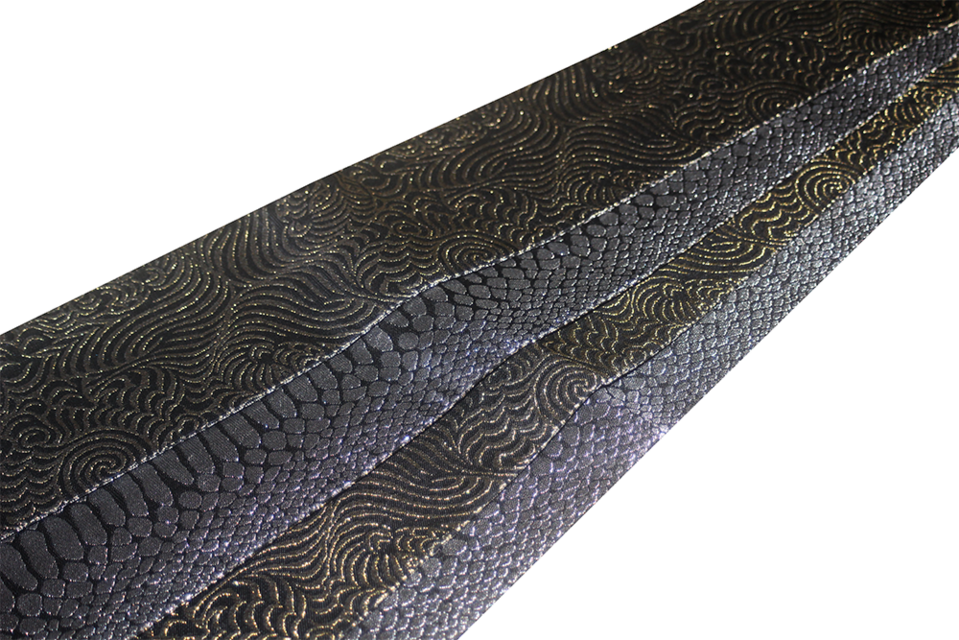 【A面:虎】流転する黄金の躍動 「流れのある表現」で描き出された虎のモチーフ。単なる模様ではなく、風を切り、しなやかに躍動する猛虎の毛並みや動きを、光の加減で表情を変える織り組織で表現しました。黄金と漆黒が織りなす輝きは、腰元に圧倒的な威風をもたらします。