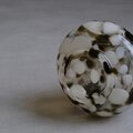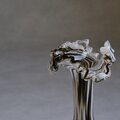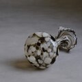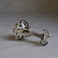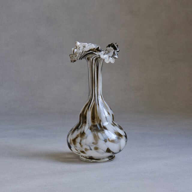 イタリア・フィレンツェに工房を構える V.S.M Florence によって、1960年代頃に制作されたガラスの花瓶。熟練した職人の手仕事によって生み出された、流れるようなフォルムと、乳白色とスモークブラウンが溶け合うマーブル模様が印象的な一点。口元にはフリル状の装飾が施され、当時のイタリアンアートガラスらしい、自由で有機的な美しさを感じさせます。花を生けた際の佇まいはもちろん、オブジェとしてそのまま置いても空間に上品で静かな存在感を与えてくれる1点。ガラスの厚みと重心の安定感があります。
