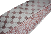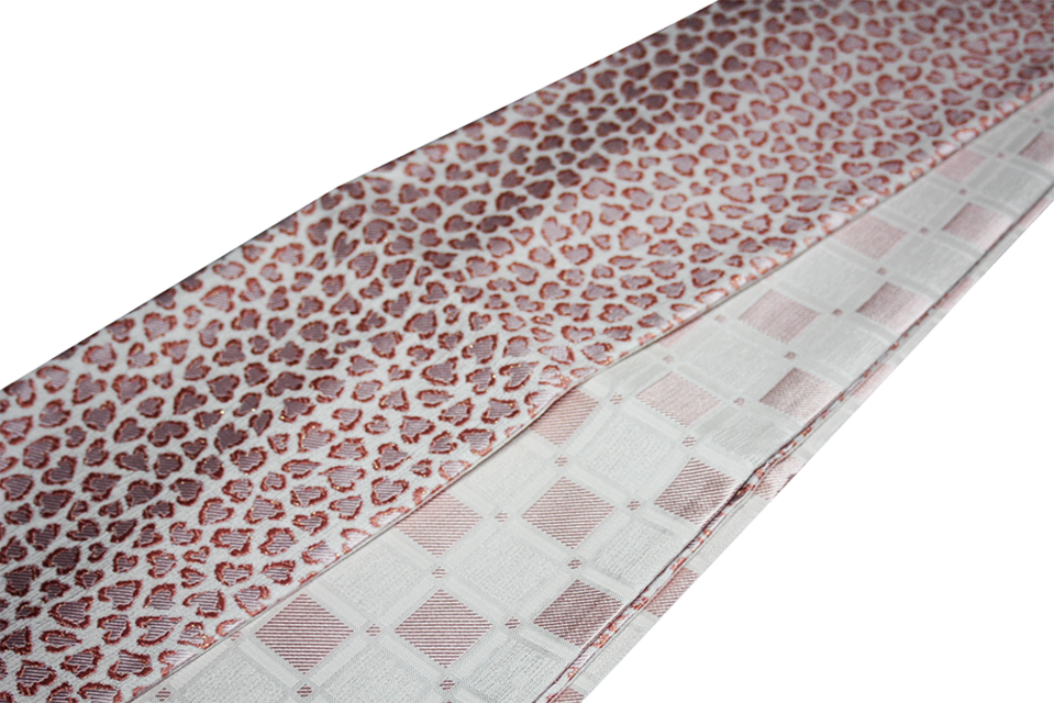 西陣の自社工房で、繊細な絹糸を巧みに操り織り上げた、リバーシブル仕様の半幅帯です。 フェミニンな「豹(ハートレオパード)」と、都会的な「変わり市松」。対照的な二つの意匠を、肌馴染みの良いピンクゴールドの色彩で上品にまとめ上げました。