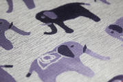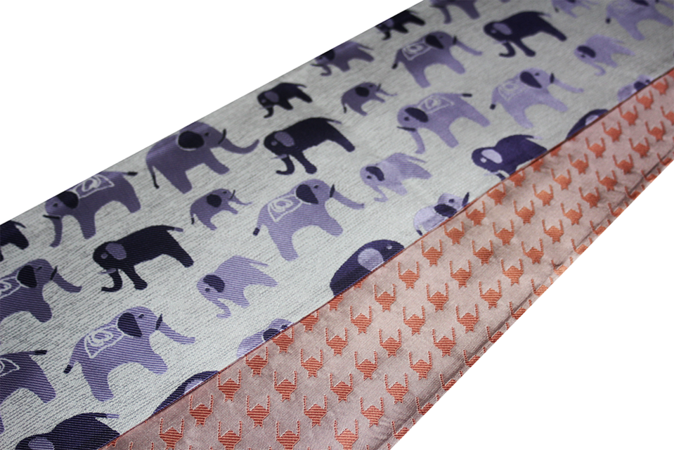 【A面:悠久の象】異国情緒漂うシックな装い 落ち着いたグレーの地に、様々な文様を纏った象たちがゆったりと歩む姿を織り出しました。紫がかった絶妙なニュアンスカラーは、大人っぽさと可愛らしさを兼ね備え、都会的なコーディネートに遊び心を添えます。