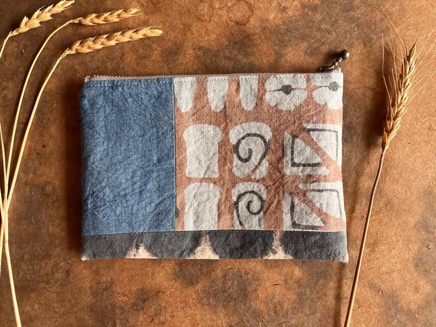 柿渋、ベンガラ泥染、藍錠などすべて染めた生地をはぎ合わせて作ったフラットポーチです。