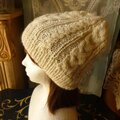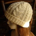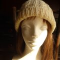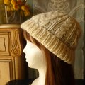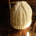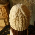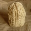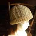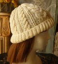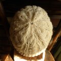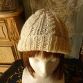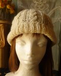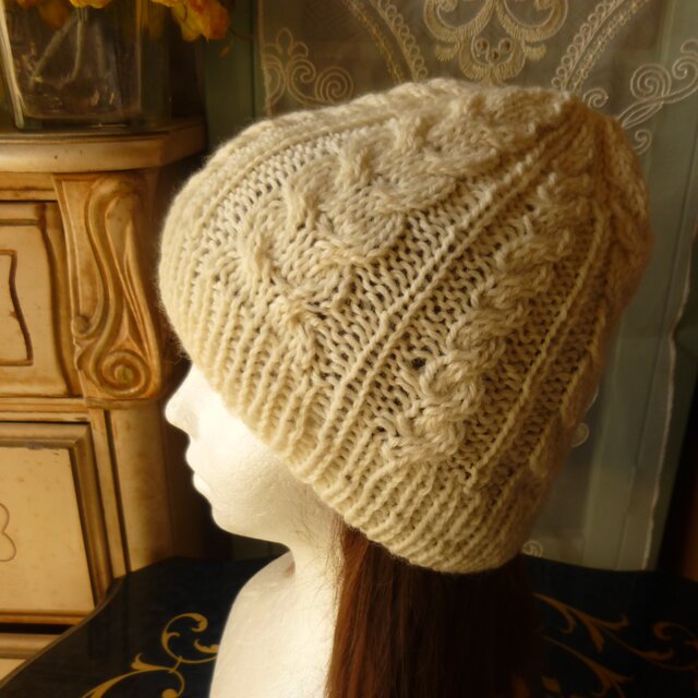 生なりの並太糸で縄編みに編んだニット帽です。縁のゴム編みは長めですので、折り曲げて被ったり、そのままで帽子のトップをとんがらせてかぶったりでします。