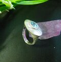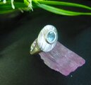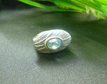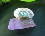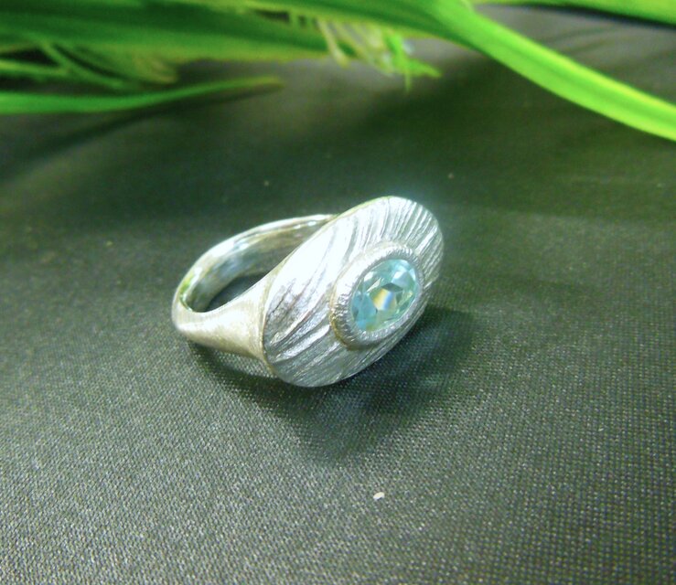ブルートパーズのリングです。トップには鏨で手彫りの、またサイドにはシルクラインのテクスチャーをつけてあります。