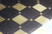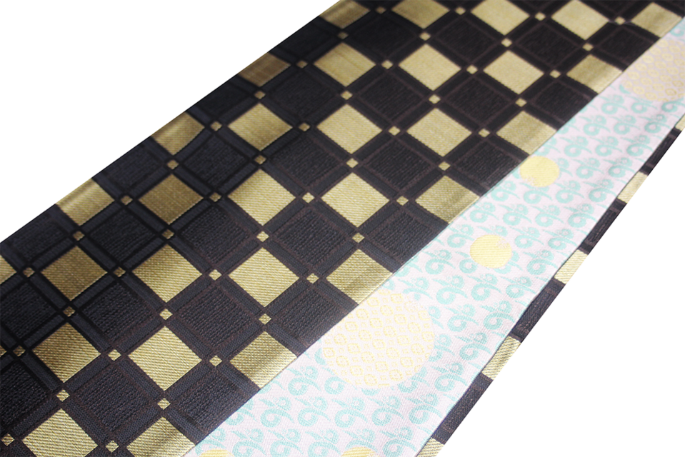 【A面:変わり市松】都会的な輝きを放つ、立体的な意匠 黒地に黄金色のスクエアを配した、シャープなデザイン。一つひとつのマス目に異なる織組織を施すことで、光の角度により複雑な陰影が生まれ、奥行きのある洗練された腰元を演出します。