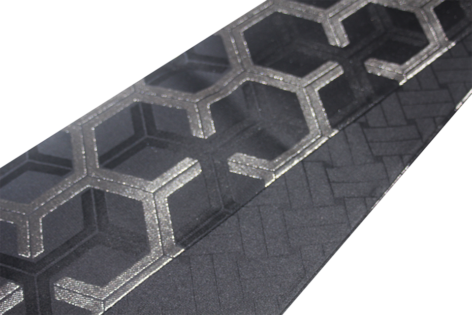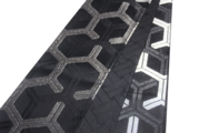 【A面:亀甲(きっこう)】大胆かつモダンな幾何学美 長寿や守護を象徴する吉祥文様「亀甲」を、現代的なビッグスケールで表現しました。銀糸の縁取りが、光を受けるたびにシャープなラインを描き出し、都会的でクールな帯姿を演出します。