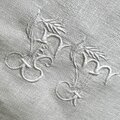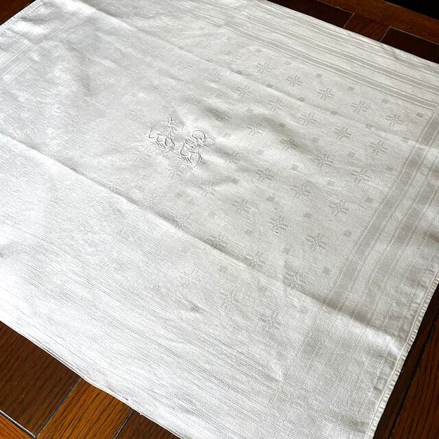 ダマスク織の白生地に、白糸でイニシャル模様が刺繍されています。