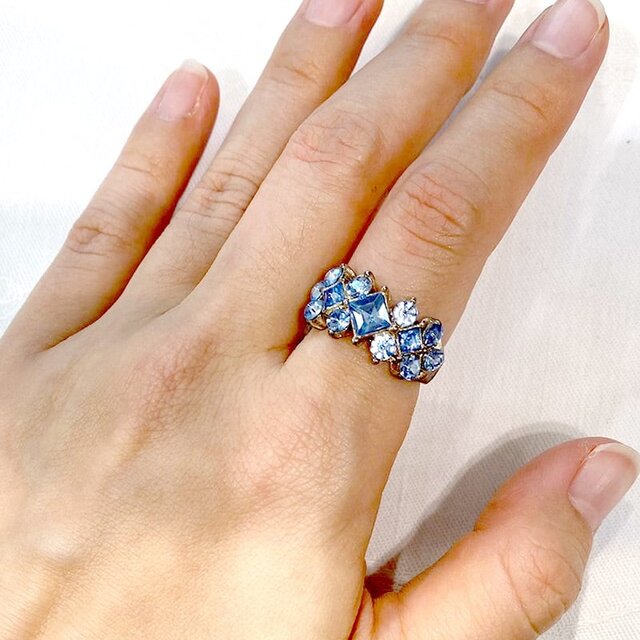 水色ガラスがキラキラ綺麗なリングです。