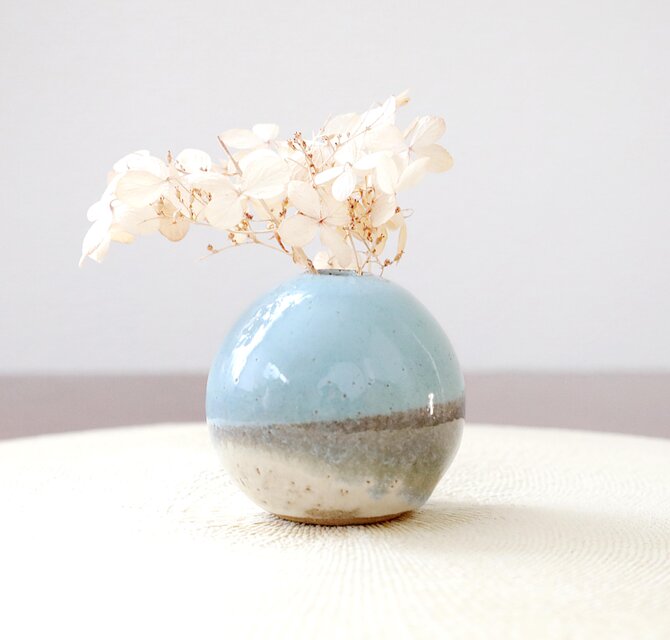 陶器らしい温もりを感じさせてくれる荒目の赤陶土を、雨雫や卵のような末広がりの楕円をイメージしながらろくろで引き上げて制作した一輪挿しです。