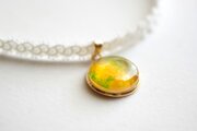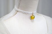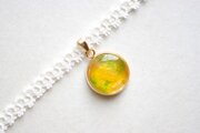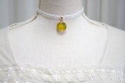 ミモザをイメージしたイエローとグリーンがフレッシュで元気いっぱいなカラーリングのレジンを、サテンリボンにタティングレースで装飾を施したチョーカーに仕上げました。