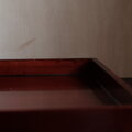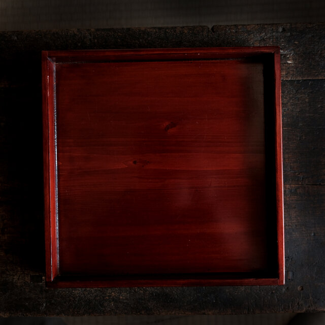 縁と盆面の繋ぎ目に木地と漆の収縮差によって生じる漆ビビや微々たる隙間など生じておりますがこの手の盆にはよく見られれる現象で、しっかりとした造りなので普通のご使用には問題ございません。
