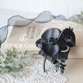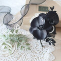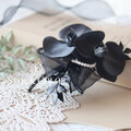 シックなブラックの胡蝶蘭を、パールとリボンで仕上げたブローチ・コサージュ。