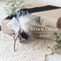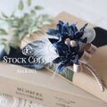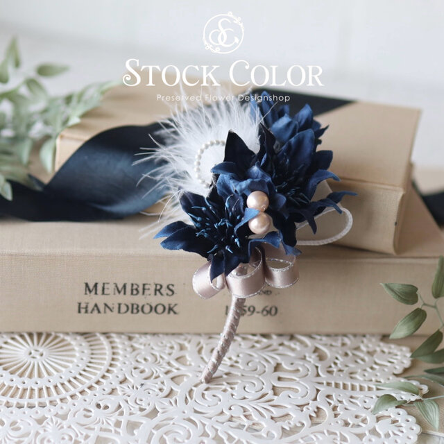 上品なダークネイビーのクレマチスに、パールとフェザーで仕上げたブートニア・コサージュ。