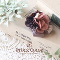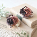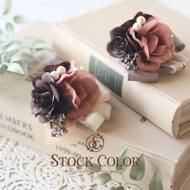 ブラウン×モーブピンクの大人可愛い色合い♪スタイリッシュなリボンアレンジで可愛くなり過ぎない上品さが魅力のコサージュです。