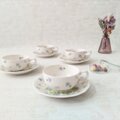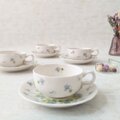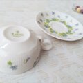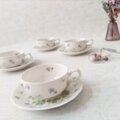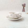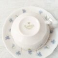 バックスタンプに記された「Lotus」は、日本名では「蓮」を意味しますが、描かれているのはアカネスミレのような愛らしい花々。白い磁器に淡いブルーとグリーンの色合いが、清楚で優雅な印象を与えます。