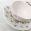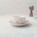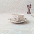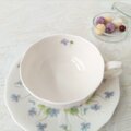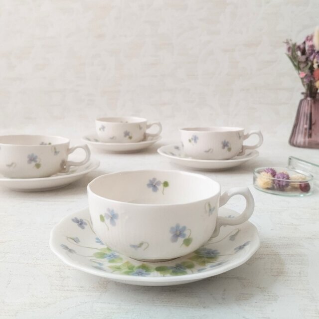 可憐なスミレの絵柄がちりばめられた、桃山陶器のヴィンテージティーカップ&ソーサーです。よく見ると、絵柄に重ねて施された水面のような放射線状のレリーフがあり、華やかさがを演出しています。