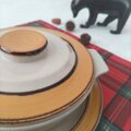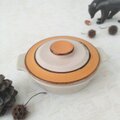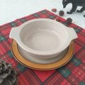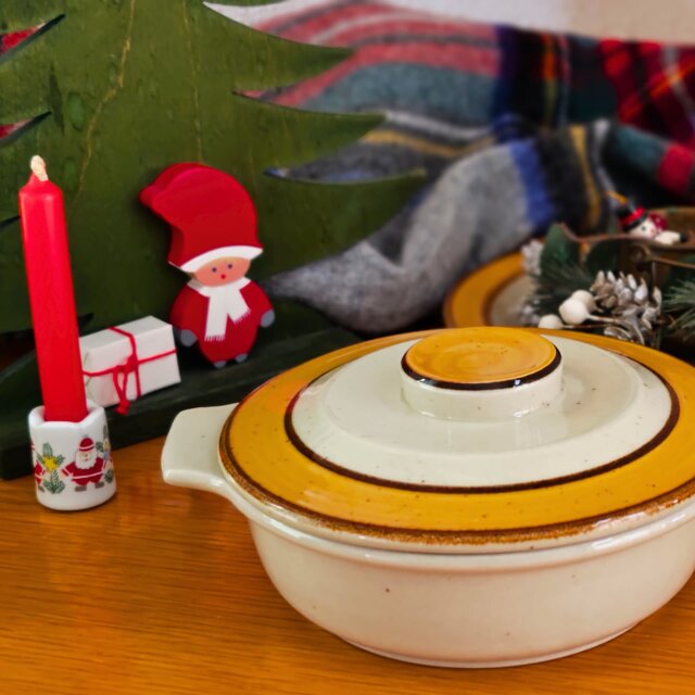 現在ではなかなか見かけない一人用キャセロールは、昭和時代に製造されたヴィンテージ品です。ストーンウェアは耐熱性(直火は不可)に優れているため、グラタンやお粥、グリル野菜の盛り付けなどに最適。我が家にある一人用キャセロールでは、漬物やちりめん山椒などの保存容器としても活用しており、その用途はアイデア次第で広がります。