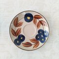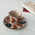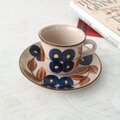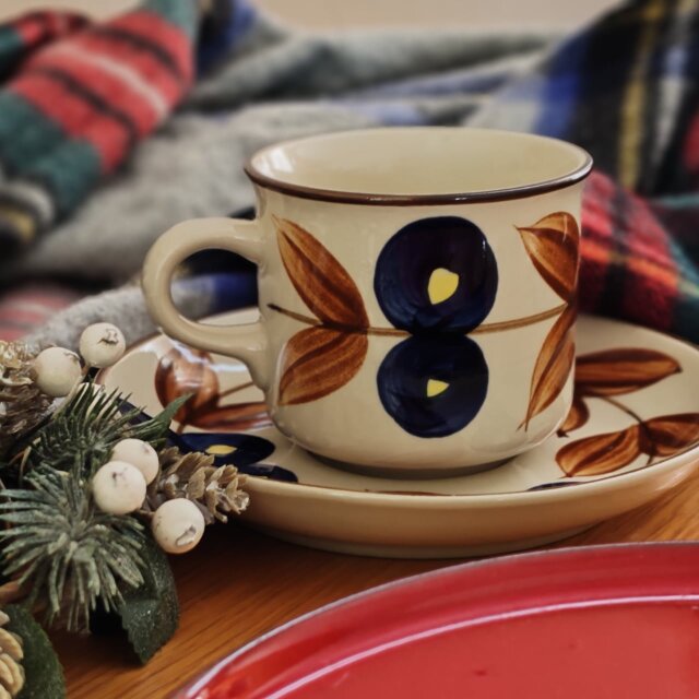 桃山陶器のヴィンテージコーヒーカップ&ソーサーです。温かみのあるストーンウェアの色味に、存在感のある手描きの花柄がアクセントになっています。カップの底裏には、ひとつひとつ丁寧に手押しされたバックスタンプがあり、個性的な表情を加えています。