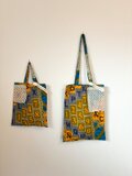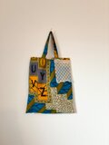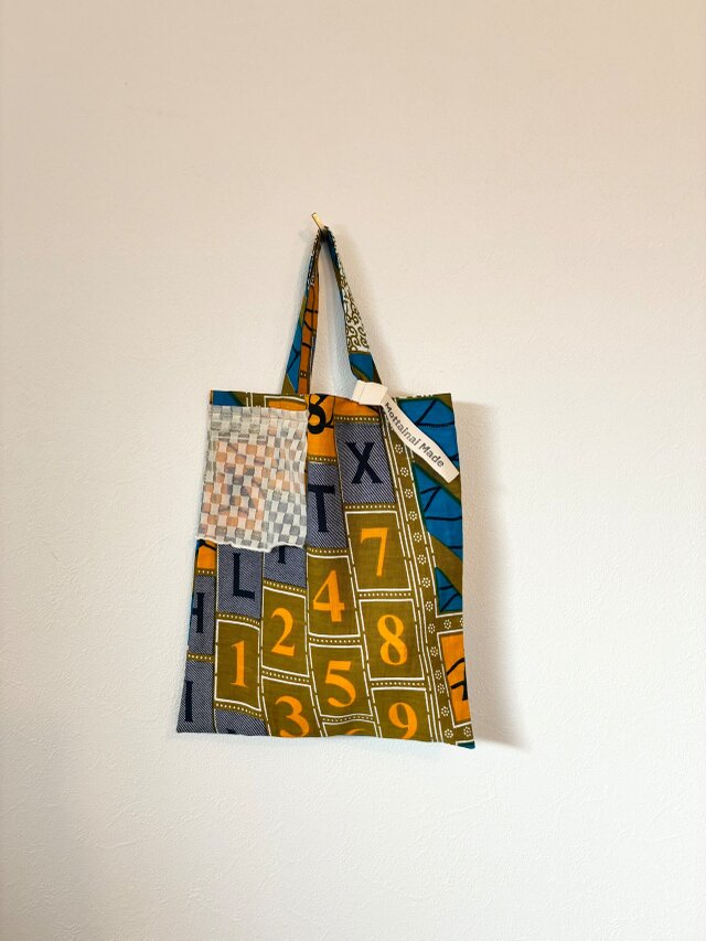 アルファベットと数字がリズミカルに並ぶアフリカンファブリックのトートバッグ(M)。