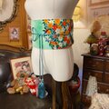 【名古屋帯 リメイク サッシュベルト 飾り帯 和洋折衷 ハンドメイド レトロ 古着 L〜LL対応 若草の静寂 × 咲きこぼれる四季の彩り ROB-194】