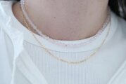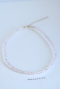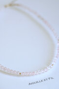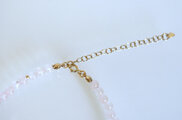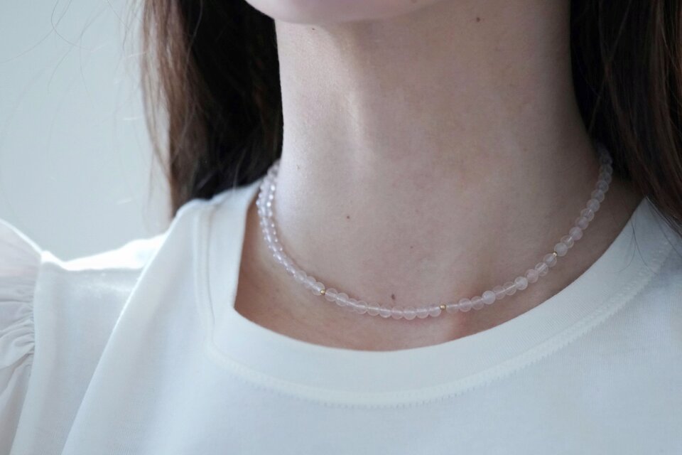 優しく儚げなローズクォーツの色味の中にアクセントにK14GF素材のゴールドのビーズを配置し、繊細で華やかな印象でお使いいただけるネックレスに仕立てました。