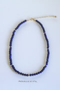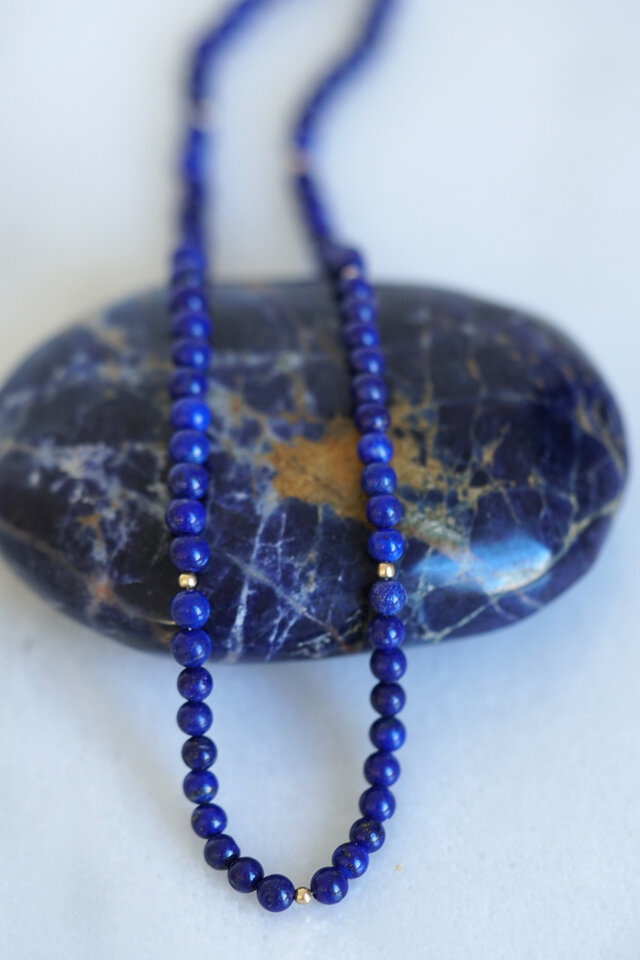 深みのあるブルーと艶のあるゴールドのK14GFのビーズのコントラストが際立ち、コーディネートのポイントに、通年お使いいただけるネックレスに仕立てました。