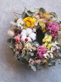 ユーカリ(5種)、ミモザ、スターチス(5種)、ラナンキュラス(2種)、コットン、ミツマタ、ニゲラの実、ラグラス、サンキライの実、花かんざし、メタセコイアの実、ユーカリベリー、アジサイ、センニチコウ、アオツヅラフジのツル、HBスターチス