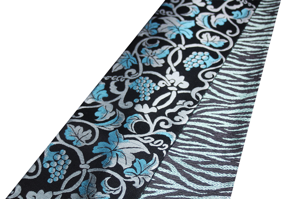 【A面:葡萄唐草】悠久の時を刻む、エレガントな輝き 深く艶やかな黒地に、鮮やかなターコイズの糸で描き出した「葡萄唐草(ぶどうからくさ)」。葡萄は多実(たじつ)であることから「子孫繁栄」や「豊穣」の象徴とされる吉祥文様です。西陣織ならではの緻密な織組織が、背姿に圧倒的な品格と物語性を添えます。