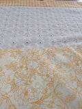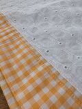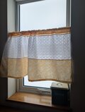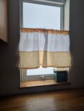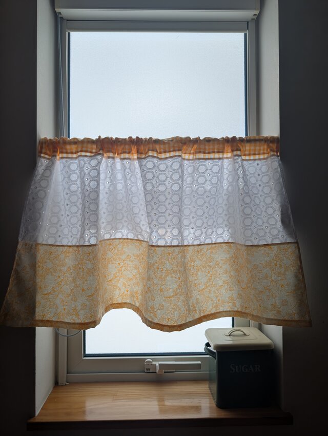 オレンジのチェックとインテリア生地の少し厚みのあるフラワー柄にどこか懐かしさを感じるホワイトコットンレース柄をアクセントにしたレトロモダンなカフェカーテン♥️