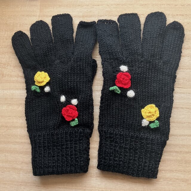 ギャラリーの絵画をイメージして手袋にばらの花を添えてみました。華麗な紅ばら黄バラに純白のかすみ草で寒い冬を楽しく過ごせますように!人気の高いブラックの暖かいウール地です。