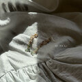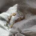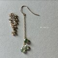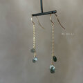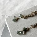 このグリーンルチルのチェーンピアスをベースに、それ単体でも可愛いのですが、さらに小粒ムーンストーンチャームを足して楽しめるように仕立てました。