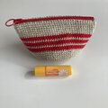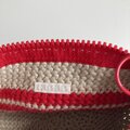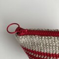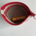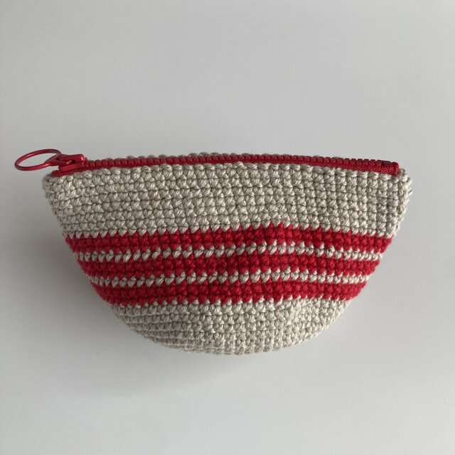 コットンの生成り、赤の糸で編んだかぎ針ポーチ