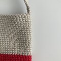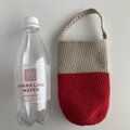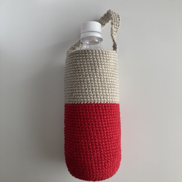 コットンの生成り、赤の糸で編んだ500ml用ボトルホルダー