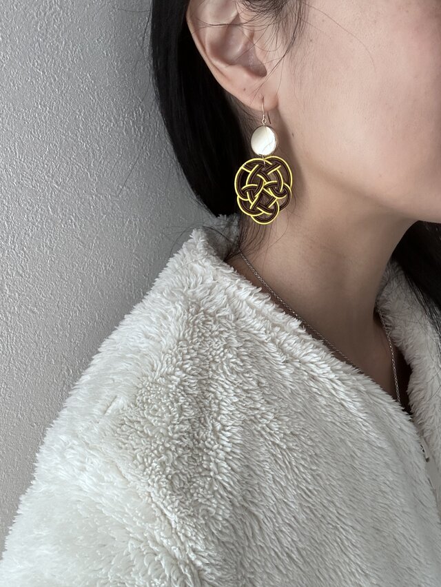 日本の伝統工芸「水引」からインスピレーションを受け、繊細で上品な亀子結びにメタルのラウンドチャームを組み合わせました。