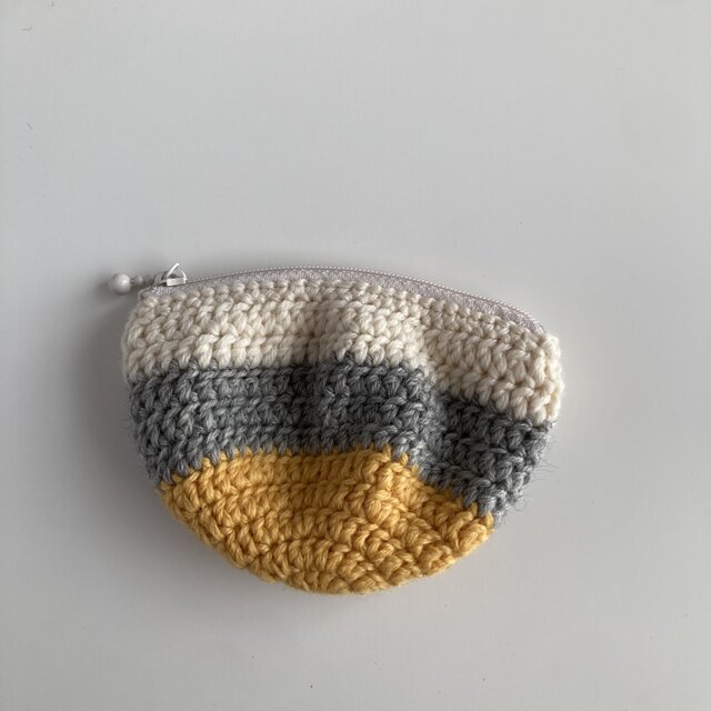 WOOL!かぎ針編みのポーチ*オフホワイト×黄×グレー*ラウンド