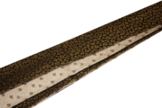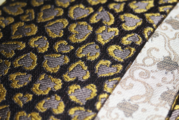 【A面:豹(レオパード)】黄金に躍動する、至高のアニマルエッジ 黒地に金糸が鮮烈に浮かび上がる豹柄です。単なるプリントにはない、織り組織の変化による立体的な毛並みの表現が、圧倒的な存在感を放ちます。力強く、都会的な「攻め」の装いに最適です。