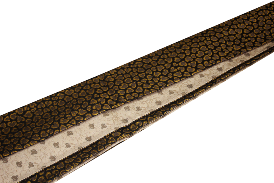 【B面:波に千鳥】伝統を纏う、優美な吉祥文様 「波を一緒に乗り越える」として、夫婦円満や家内安全を願う伝統の「波に千鳥」。落ち着いたトーンの金糸で描かれた千鳥たちが、荒波を軽やかに駆ける姿は、上品で落ち着いた「粋」を演出します。