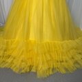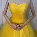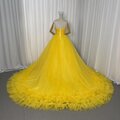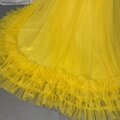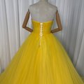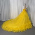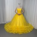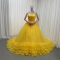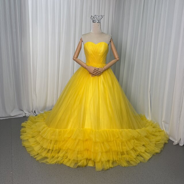 人気上昇!カラードレス イエロー ベアトップ 華やかなトレーン フレアスカート 編み上げ 披露宴