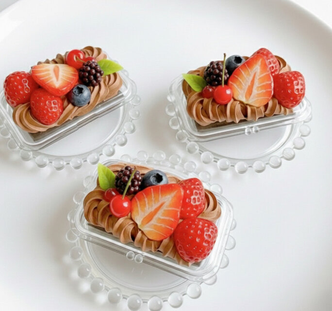 透明ケースの清潔感とスイーツモチーフの華やかさが相性抜群で、実用とインテリア性を兼ね備えたデザインに仕上げています。