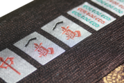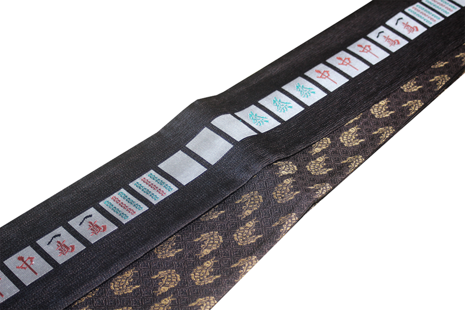 絹糸で鮮烈に浮かび上がる「白・發・中」の漢字。麻雀における役満の最高峰を、西陣織の緻密な織組織で表現しました。光の角度で文字が知的にきらめき、単なるパロディを超えた、職人の技が光る「粋」なデザインです。